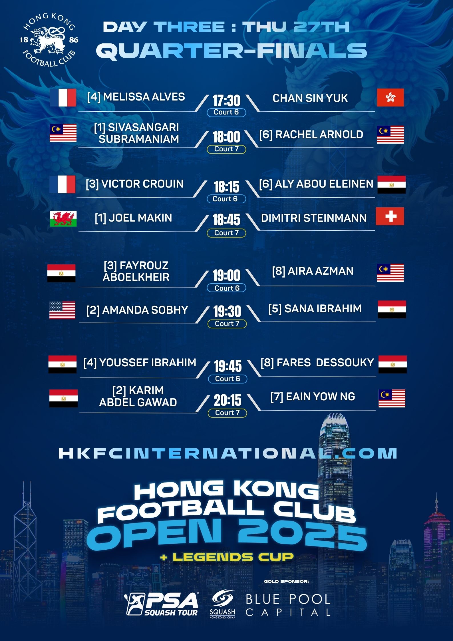 The final two matches saw home hopes exit as Scotland’s Rory Stewart overcame current HK #1 Henry Leung in four games, and Bernat Jaume brought the PSA career of HK legend Max Lee to a close, also in four games but Max, urged on by the home crowd gave it his all.